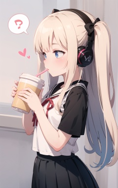 1girl, gradient, gradient_background, headphones, drinking_straw, speech_bubble, spoken_musical_note, spoken_heart, solo, drinking, long_hair, pink_shirt, spoken_blush, musical_note, disposable_cup, shirt, skirt, short_sleeves, cup, bangs, grey_background, eyebrows_visible_through_hair, spoken_question_mark, hair_ribbon, pleated_skirt, eighth_note, two_side_up, ribbon, blush, very_long_hair, one_side_up