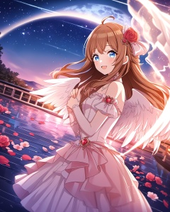 very aesthetic,aesthetic,amazing quality,best quality,hight,hight quality,masterpiece,highres BREAK beautiful eyes,luminous eyes,gentle eyes,1girl,solo,cowboy shot,disdain,Volumetric Lighting,Cinematic Lighting,oil_painting,((classicism)),motion_blur,depth of field,1girl,blue eyes,wings,rose hair ornament,flower,ahoge,long hair,brown hair,rose,wedding dress,pink bow,pink fakecollar,angelwings,:d,hands behind,glow,night,stars_(sky),moon,water,glass floor,flowers around,vision,idolmaster,dynamic angles,Hazy light,Floodlight,falling star,↘,red style,(sea),fantasy,fantastic,dreamy,blush,from side,looking_at_viewer,upper_body,dutch angle,fisheye,from above,beautiful water,beautiful sky,stars_(sky),(railway station),Light effects,Optical particle,Luminous,High brightness contrast,<lora:snclstyle-A3:0.6>,snclstyle,blurry,depth_of_field,blurry_foreground,fantasy,floral_background,<lora:jiaran-asoul-a3a-000008:0.4>,