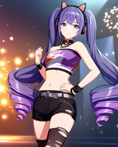 very aesthetic,aesthetic,amazing quality,best quality,hight,hight quality,masterpiece,highres BREAKbeautiful eyes,luminous eyes,gentle eyes,<lora:xiangwan-asoul-a3d:0.6>,ray tracing,very aesthetic,aesthetic,amazing quality,best quality,hight,hight quality,masterpiece,highres BREAK Volumetric Lighting,Cinematic Lighting,background light,moody lighting,dusk,1girl,solo,long hair,twintails,very long hair,blue eyes,purple hair,smile,fashion tube top,looking at viewer,animal ear headphones,black shorts,drill hair,midriff,standing,torn thighhighs,concert,<lora:snclstyle-A3:0.7>,snclstyle,blurry,depth_of_field,blurry_foreground,fantasy,floral_background,