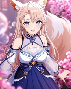 very aesthetic,aesthetic,amazing quality,best quality,hight,hight quality,masterpiece,highres BREAKbeautiful eyes,luminous eyes,gentle eyes,ray tracing,highres absurdres,masterpiece,bestquality,higher quality,best quality,blush,aesthetic,very aesthetic,best quality,hight quality,hight,vision,newest,dynamic angle BREAK 1girl,fox ears,solo,long hair,blue eyes,looking at viewer,smile,detached sleeves,breasts,large breasts,open mouth,blue hakama,white earrings,see-through,simple background,<lora:snclstyle-A3:0.7>,snclstyle,<lora:nailin-asoul-a3a:0.6>,blurry,depth_of_field,blurry_foreground,fantasy,floral_background,bubble_background,