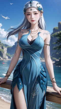 1girl, jewelry, long hair, bracelet, strapless dress, necklace, tattoo, gem, bare shoulders, white hair, aqua dress, mischevious smile, perfect body, scenery, sharp focus, best quality, masterpiece, detailed outfit, illustration, perfect eyes, finely detailed beautiful anime eyes, realistic skin, intricate details, best lighting, depth of field, ultra high resolution,cowboy_shot, dynamic pose, dynamic angle,