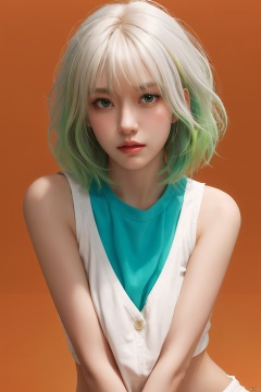 blunt bangs, masterpiece, best quality, best illustration, ultra-detailed, upper body, solo, 1 girl, looking at viewer, upright, arms at sides, beautiful detailed eyes, concept art, ((orange background))), simple background, white hair, green gradient hair, expressionless, blush, virtual youtuber, short hair,blonde hair, monkren