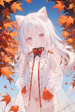 ((nsfw)),upper shot,(coat only:1.1),see-through-coat,(transparent clothes),(naked:1.2),(put both hands into pockets:1.2),best-quality,red eyes,surrounding orange Maples:1.1),(falling maple leaves),1little child,(child:1.2),petite,cuteloli,cat ears,white hair , long hair,(red inner hair)