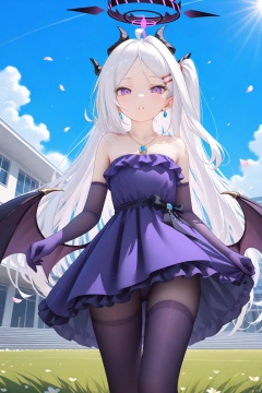 gloves, dress, bare shoulders, jewelry, pantyhose, earrings, frills, elbow gloves, necklace, petals, strapless, frilled dress, strapless dress, purple dress, purple gloves, hinaDress,parted lips ,outdoors, blue sky,sunlight, clouds, school building,lawn, hinaBA,long hair, bangs,hair ornament, very long hair, purple eyes,ahoge, white hair,wings, horns,hairclip,parted bangs, halo,demon girl, demon horns, forehead,demon wings, low wings, multiple horns,hina\(bluearchive\),hinaBA, purple thighhighs,