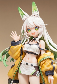 (score_9,score_8_up,score_7_up),source_anime, 1girl, solo, green eyes, smile, :d, long hair, white hair, animal ears, animal ear fluff, eyebrows visible through hair, medium breasts, navel, bare shoulders, yellow jacket, off shoulder, crop top, midriff, yellow skirt, hand up, waving, cropped legs, simple background, blue background, <lora:lvziXL-000005:0.8>
