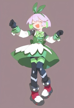 (score_9,score_8_up,score_7_up),source_anime,lvzi, short_hair, 1girl, gloves, simple_background, solo, colored_skin, black_gloves, white_background, full_body, standing, smile, boots, multicolored_hair, open_mouth, shoes, green_hair, shirt, two-tone_hair, long_sleeves, :d, hand_up, hairband, ribbon, pink_hair, outstretched_arm, grey_skin, hair_ribbon, happy, standing_on_one_leg, arm_up, bow, dress, green_hairband, green_skirt, leg_up, sidelocks, transparent_background, clenched_hands, green_bow, green_footwear, bowtie, green_dress, green_ribbon, green_bowtie, clenched_hand, closed_eyes, sleeveless, arms_up, wrist_cuffs, personification, sleeveless_dress, detached_sleeves, ^_^, facing_viewer, yellow_footwear,, <lora:lvziXL-000005:1>