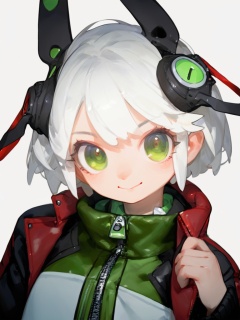 score_9, score_8_up, score_7_up, score_6_up, score_5_up,score_4_up,1girl, solo, green_eyes, smile, short_hair, simple_background, white_background, looking_at_viewer, jacket, zipper_pull_tab, white_hair, upper_body, colored_skin, closed_mouth, zipper, blue_skin, headgear, animal_ears, <lora:lvziXL-000005:0.8>