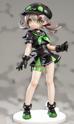(score_9,score_8_up,score_7_up),source_anime,alter, 1girl, solo, sailor_collar, green_eyes, hair_ornament, hairclip, shirt, colored_skin, school_uniform, neckerchief, simple_background, green_neckerchief, serafuku, smile, grey_hair, twintails, gloves, black_shirt, skirt, hat, black_gloves, choker, low_twintails, blue_skin, full_body, black_headwear, black_skirt, standing, short_sleeves, short_twintails, closed_mouth, black_choker, thigh_strap, shoes, white_footwear, cabbie_hat, <lora:lvziXL-000010:0.8>