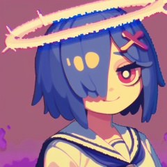 score_9, score_8_up, score_7_up, score_6_up, score_5_up,score_4_up,Pixel art,{glitch art},1girl,solo,:3,{{mesugaki}},[naughty face],medium hair,halo,[x hair ornament],[[hollow eyes]],dark blue eyes,dark blue hair,{hair over one eye},[perfect oval iris],long sleeves,long sailor collar,mosaic,[The background features a Weird Core style], <lora:lvziXL-000010:0.6>