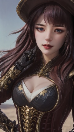 mhc,1girl,solo,mhc dress,long hair,black gloves,looking at viewer,wear gloves on left hand,gold handguard,golden sshoulder armor,magenta hair,pirate_hat,(portrait:1.5),blue_sky,baiyun,tanono,mount,rose field,