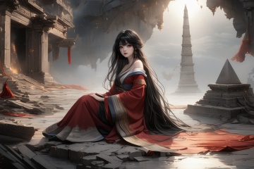 medium long shot,shining the light,pyramid,cinematic,masterpiece,facial detail,very charming eyes,extreme beautiful face,shining the light,cinematic,masterpiece,best quality,best quality,Amazing,finely detail,Depth of field,extremely detailed CG unity 8k wallpaper,masterpiece,full body,Blood fog,floating hair,light shafts,soft focus,character focus,disheveled hair,long bangs,looking at viewer,lowing hair,floating,Long hair,black hair,red eyes,1girl,hanfu,off shoulder,sit by side,feeling of ruins,gray background,broken details,tears,lonely,despair,Cosmic wormhole on right hand,a wormhole,wasteland,<lora:XLChinese wasteland:1>,