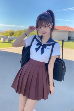 jk2, 1girl, solo, school uniform, skirt, bag, ponytail, long hair, serafuku, smile, ribbon, outdoors, short sleeves, pleated skirt, bracelet, hair ribbon, sailor collar, shirt, day, black hair, pink ribbon, school bag, sky, blue sky, jewelry, standing, black skirt, white shirt, brown hair, jk, Nakagawa_Kokoro, Hashimoto_Kanna