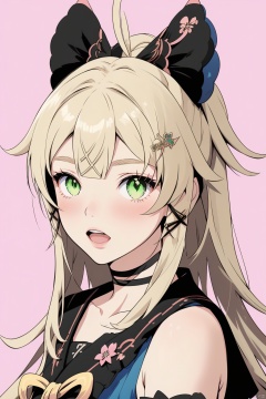 kirara, 1girl, solo, green eyes, long hair, open mouth, looking at viewer, virtual youtuber, hair ornament, ahoge, bangs, choker, blonde hair, bare shoulders, simple background, pink background, blush, teeth, hair between eyes, portrait, collarbone, gradient