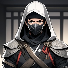 ninja, 1boy, solo, upbody, looking at viewer, gloves, male focus, black gloves, hood, armor, mask, shoulder armor, mouth mask, japanese armor