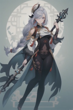 shenhe, 1girl, shenhe \(genshin impact\), weapon, hair over one eye, solo, long hair, bodysuit, braid, polearm, hip vent, full body, breasts, breast curtain, hair ornament, jewelry, earrings, holding, holding weapon, gloves, tassel, clothing cutout, toenails, grey hair, chinese clothes, white hair, looking at viewer, braided ponytail, tassel earrings, holding polearm, bangs, covered navel, closed mouth