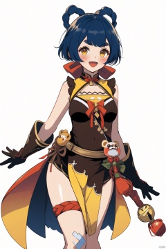xiangling, 1girl, xiangling \(genshin impact\), smile, gloves, fingerless gloves, chinese clothes, breasts, dress, bell, hair rings, china dress, open mouth, looking at viewer, blush, short hair, medium breasts, fire, blue hair, yellow eyes, covered navel, braid, arm up, :d, brown gloves, salute, jingle bell, bangs, white background, thigh strap, bare shoulders, solo, vision \(genshin impact\), sleeveless, sleeveless dress, black dress, thick eyebrows, teeth, bandaid on leg, hair ornament, short eyebrows, thighs, >_<, bandaid on knee, black gloves, bandaid, upper teeth only, standing, simple background