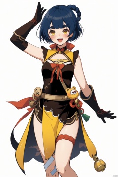 xiangling, 1girl, xiangling \(genshin impact\), smile, gloves, fingerless gloves, chinese clothes, breasts, dress, bell, hair rings, china dress, open mouth, looking at viewer, blush, short hair, medium breasts, fire, blue hair, yellow eyes, covered navel, braid, arm up, :d, brown gloves, salute, jingle bell, bangs, white background, thigh strap, bare shoulders, solo, vision \(genshin impact\), sleeveless, sleeveless dress, black dress, thick eyebrows, teeth, bandaid on leg, hair ornament, short eyebrows, thighs, >_<, bandaid on knee, black gloves, bandaid, upper teeth only, standing, simple background