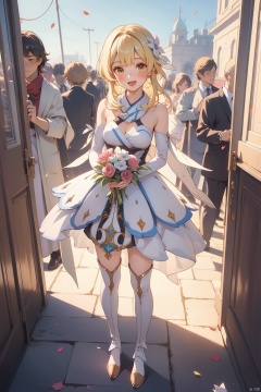lumine, lumine \(genshin impact\), flower, blonde hair, breasts, white dress, smile, hair ornament, dress, hair flower, cleavage, yellow eyes, bangs, bare shoulders, holding, open mouth, 1girl, thighhighs, thigh boots, looking at viewer, bird, short hair with long locks, detached sleeves, :d, hair between eyes, bouquet, medium breasts, outdoors, white scarf, solo focus, sidelocks, boots, blush, standing, petals, red flower, feathers, scarf