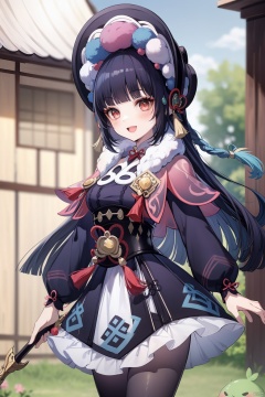 yunjin, 1girl, bangs, blunt bangs, smile, red eyes, pantyhose, long hair, blurry, looking at viewer, long sleeves, vision \(genshin impact\), dress, solo, :d, lolita fashion, blurry background, open mouth, holding, bonnet, capelet, purple pantyhose, weapon, black hair, tassel, holding weapon, depth of field, polearm, breasts, holding polearm, makeup, cowboy shot, hand up, hime cut, fur collar, sky, black corset, slime \(genshin impact\), purple hair, blush, corset, hat, sidelocks, frilled dress, frills, pom pom \(clothes\)