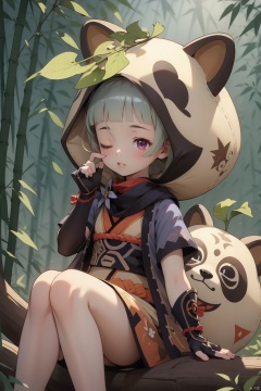 sayu, 1girl, daruma doll, leaf on head, nature, leaf, animal hood, forest, hood, short hair, raccoon ears, animal ears, fingerless gloves, one eye closed, gloves, bangs, sitting, tail, blunt bangs, black gloves, fake tail, solo, looking at viewer, japanese clothes, raccoon tail, fake animal ears, sleepy, bamboo, purple eyes, ninja, short sleeves, sidelocks, scarf, parted lips, outdoors, shuriken