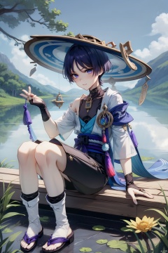 scaramouche, pom pom \(clothes\), 1boy, scaramouche \(genshin impact\), shirt, vision \(genshin impact\), jingasa, bangs, blue gemstone, black shirt, hat, male focus, short sleeves, short hair, blunt ends, leaf, vest, closed mouth, sleeveless shirt, gem, sitting, black shorts, blue headwear, water, shorts, purple eyes, branch, sandals, bird, jewelry, gold, mandarin collar, open vest, lake, solo, sky, ring, flower, sleeveless, looking to the side, necklace, black bow, outdoors, open clothes, hand up, black footwear, bow, arm up, lily pad, hair between eyes, hand on headwear, tree, blue sky, official alternate costume, grass, grey vest, socks, black belt, purple hair, toenails, blue vest, grey socks, white vest, artist name, belt, blue hair, collarbone, cloud, purple belt, wide sleeves, parted bangs, tassel, white socks, bridal gauntlets, fingernails, mountain