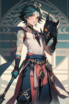 xiao, xiao \(genshin impact\), solo, male focus, 1boy, holding, jewelry, yellow eyes, gloves, weapon, tattoo, necklace, multicolored hair, beads, mask, polearm, holding weapon, green hair, facial mark, ahoge, bead necklace, looking at viewer, forehead mark, arm tattoo, holding polearm, spear, parted lips, black hair, bangs, holding mask, black gloves, sleeveless, vision \(genshin impact\)