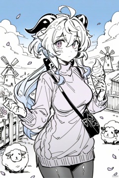 line-drawing-style, masterpiece,best quality,monochrome, greyscale, 1girl, ganyu \(genshin impact\), solo, outdoors, long hair, goat horns, ice cream, horns, flower, purple eyes, blue hair, sweater, petals, looking at viewer, pantyhose, food, bag, turtleneck, ahoge, bangs, blush, windmill, purple flower, sheep, turtleneck sweater, holding, fence, breasts, cloud, day, long sleeves, sky, handbag, shoulder bag, building, falling petals, cowboy shot, closed mouth, floating hair, dress, animal, black pantyhose, purple sweater, hair between eyes, pink flower, medium breasts, standing, sidelocks, cable knit, blue sky, tree, holding food