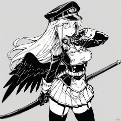 (line-drawing-style),(masterpiece,best quality),monochrome, greyscale,1girl, hat, thighhighs, holding, solo, gloves, black gloves, wings, looking at viewer, skirt, epaulettes, military, military uniform, garter straps, black wings, uniform, long sleeves, black thighhighs, weapon, long hair, belt, military hat, blurry background, parted lips, grey eyes, holding weapon, black headwear, cowboy shot, breasts, blurry, white hair, pleated skirt, black jacket