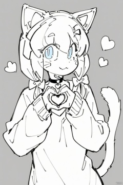 (line-drawing-style),(masterpiece,best quality),monochrome, greyscale,solo, 1girl, animal_ears, heart, solo, cat_ears, grey_hair, tail, cat_tail, hair_ornament, blue_eyes, twintails, heart_hands, looking_at_viewer, cat_girl, shirt, bangs, choker, long_sleeves, :3, black_choker, closed_mouth, smile, white_shirt, hairclip, bow, fang, sleeves_past_wrists, long_hair, upper_body, low_twintails, tail_raised, hair_bow, striped<, ears down,source_furry