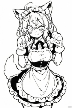 line-drawing-style, masterpiece,best quality, monochrome, greyscale,1girl,solo,bangs,blush,smile,looking at viewer,ahoge,animal ear fluff,animal ears,animal hands,apron,blonde hair,blue eyes,braid,chibi,closed mouth,dog ears,dog tail,dress,enmaided,frilled apron,frilled dress,frills,gloves,hair between eyes,hands up,long hair,maid,maid apron,maid headdress,one eye closed,puffy short sleeves,puffy sleeves,short sleeves,tail,teeth,waist apron,white apron,white gloves,