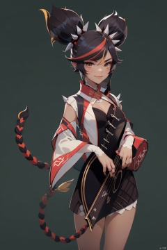 xinyan, 1girl, instrument, solo, dark-skinned female, holding instrument, dark skin, multicolored hair, looking at viewer, yellow eyes, black hair, twintails, breasts, holding, smile, two-tone background, spikes, streaked hair, guitar, bangs, cleavage, red hair, braid, black nails, chinese clothes, red background, detached sleeves, simple background, shoulder spikes, dress