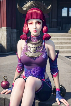 (best quality,masterpiece:1.2),ultra detailed,8k,RAW photo,realistic,photorealistic,ultra-detailed,intricate detail,extremely detailed,delicate pattern,looking atviewer,,1girl,solo,pink hair,horns,red eyes,makeup,lips point,lips tattoo,bangs,pink eyes,hair ornament,blunt bang,bare shoulders,detached sleeves,blet,shorts,fingerless gloves,gourd,sitting,