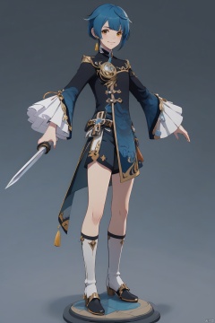 xingqiu, xingqiu \(genshin impact\), 1boy, male focus, weapon, solo, blue hair, sword, holding, jewelry, shorts, frills, single earring, frilled sleeves, earrings, long sleeves, holding weapon, boots, holding sword, chinese clothes, bangs, blue shorts, looking at viewer, water, tassel earrings, smile, closed mouth, tassel, short hair, standing, wide sleeves, full body, shirt, asymmetrical bangs, yellow eyes, white footwear, frilled shirt collar, simple background, black shorts