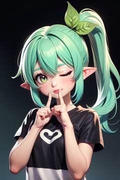 chibi,1girl,solo,one eye closed,pointy ears,green eyes,hair ornament,finger to mouth,multicolored hair,shirt,gradient hair,symbol-shaped pupils,looking at viewer,side ponytail,black shirt,white hair,bangs,short sleeves,upper body,long hair,hair between eyes,green hair,sidelocks,leaf hair ornament,cross-shaped pupils,index finger raised,, masterpiece,best quality,very aesthetic,absurdres,