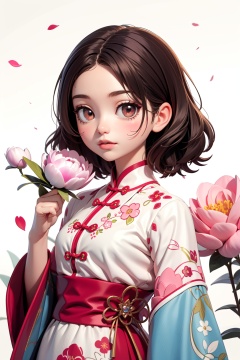1girl,solo, an animated character with brown hair and large, expressive eyes. She is surrounded by peonies, wearing a traditional Chinese blouse with intricate designs. The overall tone of the image is soft and pastel, with a touch of elegance, masterpiece,best quality,very aesthetic,absurdres,