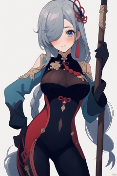 shenhe, 1girl, shenhe \(genshin impact\), solo, weapon, long hair, covered navel, breast curtain, hair over one eye, breasts, bodysuit, hip vent, braid, tassel, polearm, hair ornament, large breasts, shoulder cutout, looking at viewer, grey hair, braided ponytail, blue eyes, clothing cutout, tassel earrings, black bodysuit, bangs, very long hair, jewelry, earrings, closed mouth, cowboy shot, gloves, holding, holding weapon, blush, puffy long sleeves, grey background, simple background, puffy sleeves