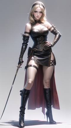 (best quality), ((masterpiece)), (highres), illustration, original, extremely detailed, 1girl, weapon, solo, bow \(weapon\), breasts, blonde hair, high heels, boots, blue eyes, white background, high heel boots, full body, cleavage, gloves, hand on hip, simple background, hairband, quiver, long hair, looking at viewer, bare shoulders, standing, choker, holding, skirt, holding weapon, large breasts, arrow \(projectile\), gauntlets, thigh strap, medium breasts
