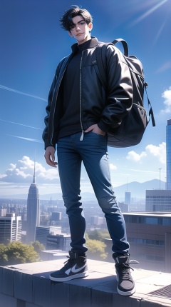 (best quality), ((masterpiece)), (highres), illustration, original, extremely detailed,dbj, solo, pants, 1boy, male focus, full body, jacket, black hair, standing, sky, shoes, black shirt, black footwear, shirt, black pants, bag, hand in pocket, black jacket, outdoors, cloud, closed mouth, day, long sleeves, black eyes, short hair, smile, backpack, looking at viewer, building, blue sky, zipper, city, sneakers, open clothes, open jacket, cityscape