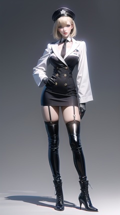 (best quality), ((masterpiece)), (highres), illustration, original, extremely detailed,1girl, solo, gloves, cross-laced footwear, boots, garter straps, white background, white gloves, hat, union jack, high heels, thighhighs, buttons, standing, full body, simple background, blonde hair, black footwear, lace-up boots, looking at viewer, detached sleeves, sailor collar, asymmetrical footwear, white headwear, bangs, high heel boots, peaked cap, breasts, microdress, parted lips, dress, adjusting clothes, flag print, black dress, thigh boots, knee boots, skindentation, double-breasted, aqua eyes, hair between eyes, asymmetrical legwear, blue eyes, medium breasts, necktie, white thighhighs, medium hair, long sleeves, jacket, collarbone