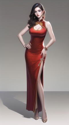 (best quality), ((masterpiece)), (highres), illustration, original, extremely detailed, 1girl, solo, dress, brown hair, breasts, high heels, jewelry, cleavage cutout, china dress, chinese clothes, cleavage, side slit, clothing cutout, earrings, long hair, blue eyes, hand on hip, bracelet, full body, white background, legs, simple background, red dress, large breasts <lora:2CY_YJ:0.8>