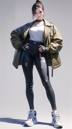 (best quality), ((masterpiece)), (highres), illustration, original, extremely detailed,1girl, solo, white background, full body, jacket, gloves, ponytail, pants, simple background, jewelry, choker, earrings, white footwear, shirt, looking at viewer, hand on hip, standing, fingerless gloves, brown jacket, twitter username, brown hair, shoes