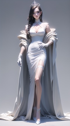 (best quality), ((masterpiece)), (highres), illustration, original, extremely detailed, bbj, solo, 1girl, dress, breasts, long hair, white background, white dress, simple background, full body, cleavage, looking at viewer, crown, white footwear, parted lips, blue eyes, gloves, bangs, floating hair, large breasts, mini crown, braid, white gloves, elbow gloves, jewelry