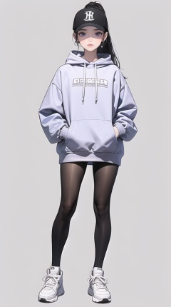 (best quality), ((masterpiece)), (highres), illustration, original, extremely detailed,bbj, 1girl, solo, hoodie, hood, ponytail, shoes, black hoodie, sneakers, baseball cap, full body, black hair, hat, simple background, purple eyes, pantyhose, white background, looking at viewer, sidelocks, standing, black pantyhose, long hair, hood down, long sleeves, white footwear, hands in pockets, black headwear, closed mouth, mole, drawstring, ear piercing