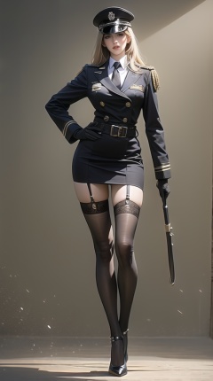(best quality), ((masterpiece)), (highres), illustration, original, extremely detailed,1girl, solo, thighhighs, high heels, long hair, hat, uniform, blonde hair, garter straps, skirt, riding crop, military, military uniform, gloves, navel, midriff, hand on hip, necktie, full body, miniskirt, belt, black thighhighs, looking at viewer, peaked cap