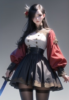 (best quality), ((masterpiece)), (highres), illustration, original, extremely detailed,1girl, solo, pantyhose, eyepatch, long hair, blue eyes, hair ornament, weapon, flower, breasts, skirt, bridal garter, black pantyhose, black hair, hair flower, white background, sword, uniform, simple background