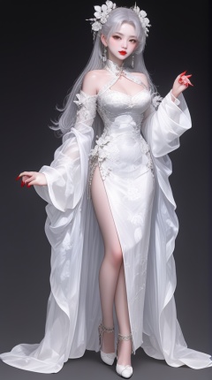 (best quality), ((masterpiece)), (highres), illustration, original, extremely detailed,   <lora:武侠与剑仙:0.7>1girl, solo, dress, long hair, jewelry, white dress, earrings, full body, hair flower, detached sleeves, breasts, looking at viewer, flower, clothing cutout, red lips, hair ornament, side slit, chinese clothes, grey eyes, bangs, black background, simple background, white footwear, hand on hip, grey background, china dress, grey hair, cleavage cutout, bare shoulders, standing, white flower, high heels, cleavage, medium breasts, nail polish, red nails, wide sleeves, long sleeves, lips