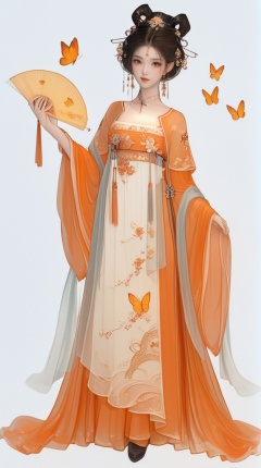 (best quality), ((masterpiece)), (highres), illustration, original, extremely detailed,   <lora:武侠与剑仙:0.7>1girl, solo, hand fan, butterfly, bug, holding fan, white background, holding, jewelry, dress, full body, chinese clothes, hair ornament, earrings, simple background, long sleeves, hanfu, orange dress, looking at viewer, folding fan, standing, hair bun