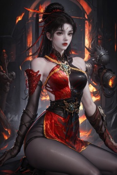 future002,strapless dress,Red dress,hair ribbon,long hair,black hair,chinese clothes,black legwear,<lora:future001-0417:0.9>,absurdres,looking_at_viewer,lawn,sitting,, best quality,masterpiece,highres,official art,extremely detailed cg unity 8k wallpaper,