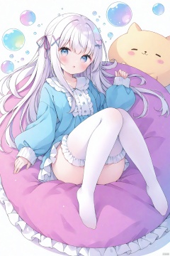 :o, white thighhighs, frilled thighhighs, pillow, breasts,