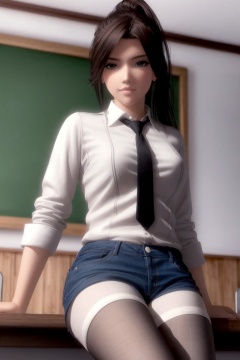 ((HRD, HUD, 8K)),((masterpiece, best quality)), highly detailed, soft light,1girl, solo, black hair, brown hair, long hair, ponytail, lips, black eyes, (white shirt:1.2), necktie, denim shorts, black pantyhose,blurry background, classroom, chalkboard, sitting, cowboy shot, looking at viewer, <lora:20240504-1714817809601:0.7>